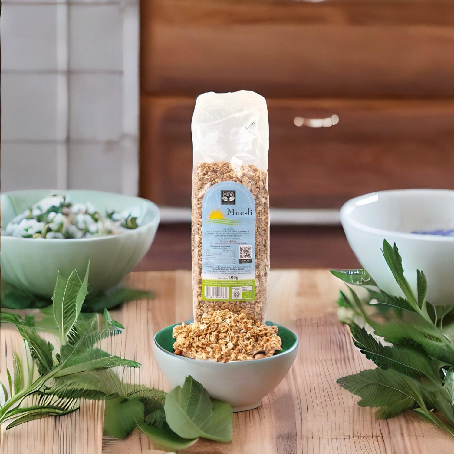 Spelt monococo flakes, oat flakes, puffed spelt dicocco, almonds, dried apples, brown sugar.