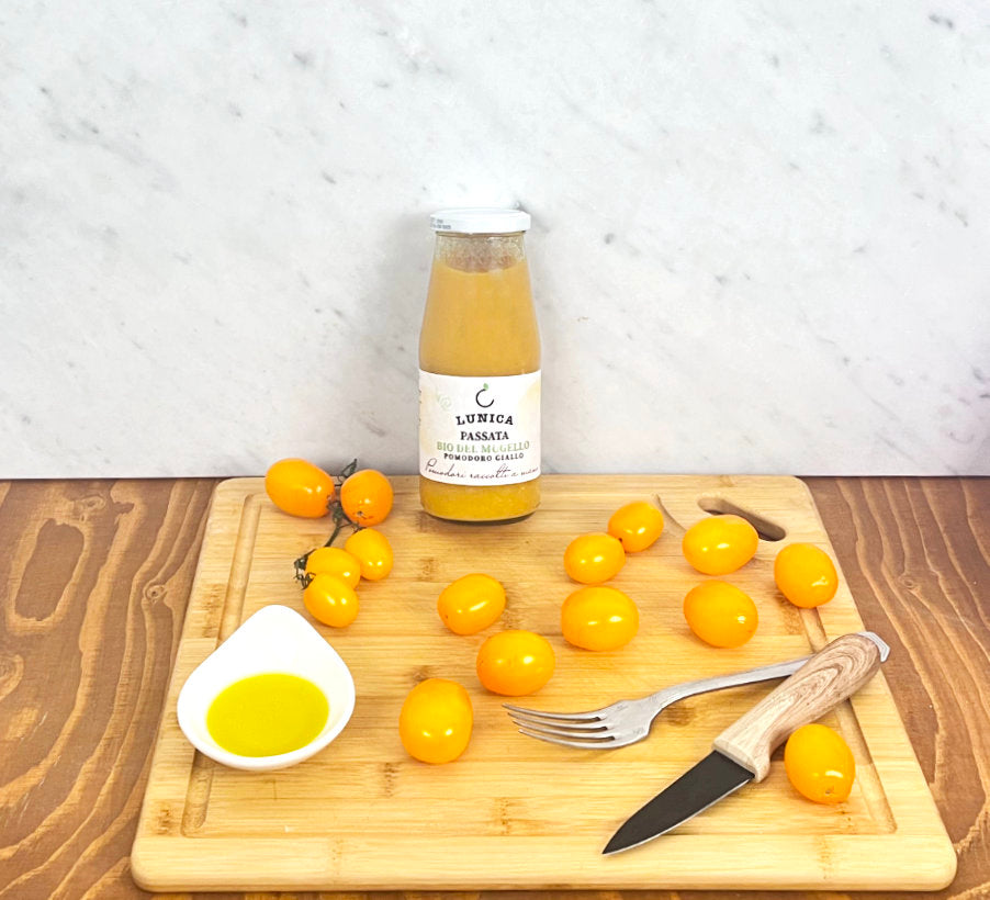 Ingredients: yellow tomatoes* 99%, salt, acidity regulator: citric acid. *=From organic farming. Average nutritional values per 100 grams of product: energy value 134kj-32kcal fat 0g of which saturated fatty acids 0g carbohydrates 5.2g of which sugars 5.2g fibre 1.3g protein 1.5g salt 0.41g
